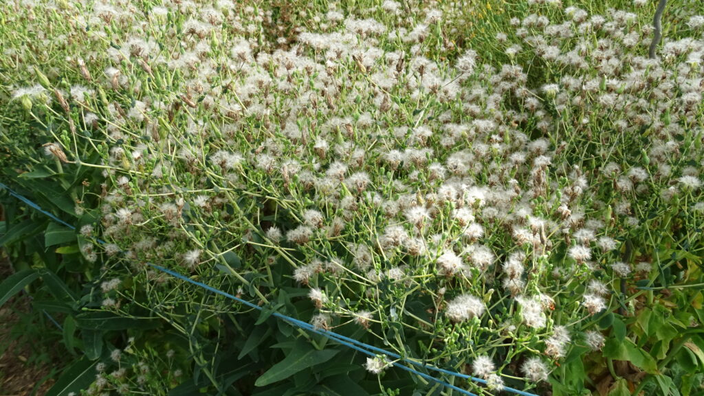 Zur Gewinnung von Samen einzelne Köpfe schießen lassen. Der Salatkopf zur Samengewinnung sollte groß sein und eine gute Kopfbildung haben. Dafür reichen schon 2-3 Köpfe, besser sind 5-10. Die selektierten Pflanzen gut markieren. Ein blühender Kopfsalat wird 1 m hoch, deshalb anbinden und vor Regen schützen. Die Samenernte erfolgt nur an trockenen Tagen! Reif sind sie, wenn sich, ähnlich wie beim Löwenzahn, oben an den Fruchtständen kleine, weiße Schirmchen zeigen. Der Reifeprozess zieht sich über mehrere Wochen hin, deshalb entweder alle paar Tage die reifen Früchtchen durchernten oder den Zeitpunkt abpassen, wenn ein Großteil der Samenkapseln reif ist und dann den ganzen Samenträger ernten. Die Pflanze kann in einen großen Eimer/Bottich 3-5 mal kräftig ausgeschlagen werden, sodass die reifen Samen herausfallen. Vorsichtig in die Schüssel pusten, sodass sich die leichteren Kapselreste von den Samenkörnern trennen. Beschriftung bitte nicht vergessen.
